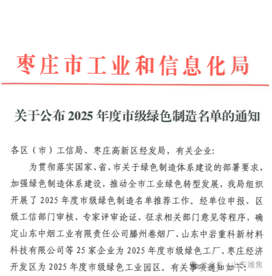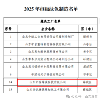山東中科綠碳公司入選2025年棗莊市級綠色制造企業榜單
